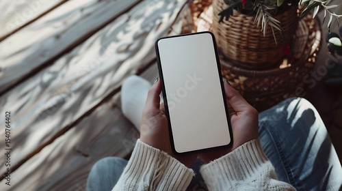 Smartphone held in hands, blank screen, outdoor setting.