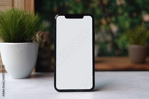 Smartphone mockup with blank screen and succulent plant on wooden table.Generative Ai