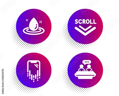 Smartphone recovery, Fuel energy and Scroll down icons simple set. Halftone dots button. Employees talk sign. Phone repair, Petroleum, Swipe screen. Collaboration. Technology set. Vector