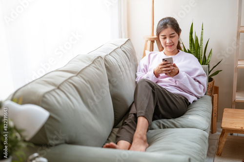 smartphone, relaxation, communication, comfortable, message, living, chat, social, sofa, network. A woman is sitting on a couch and looking at her smartphone. She is wearing a pink sweater.