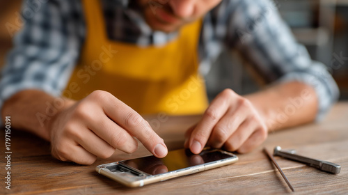 Smartphone screen repair process with defocused tools, faceless service work, fixing visualization detail, blurred repair background, service concept, technician interface, repair