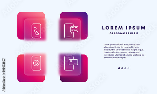 Smartphone service set icon. Phone with call, handset, message, mail, bank card. Basic phone functions concept. Glassmorphism style. Vector line icon for Business and Advertising