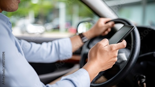 Smartphone use while driving during a busy road trip with closeup view of hand on steering wheel and phone