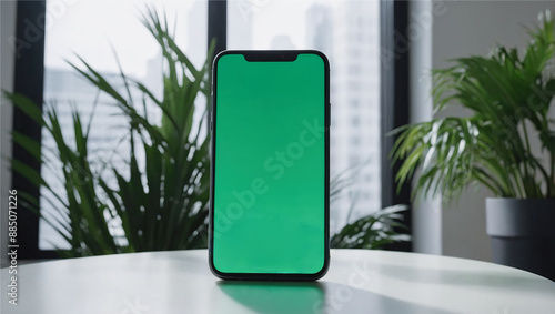 Smartphone with a green screen placed on a table, surrounded by green plants.