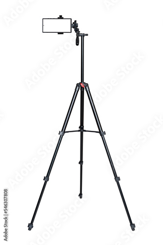 Smartphone with blank screen on the tripod camera isolated on white background.