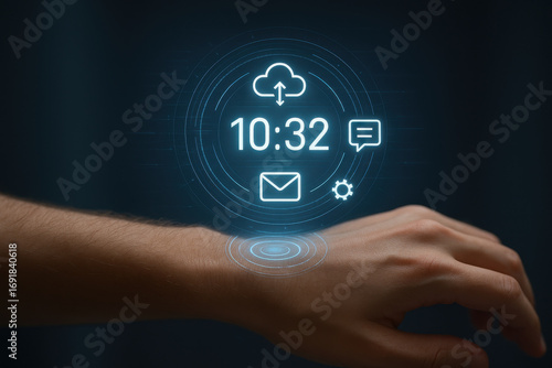 Smartwatch interface with digital icons showing time and notifications on wrist