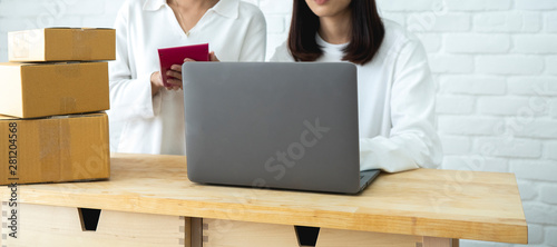 SME or freelance girl working at home concept. Checking the customer orders from email or website and preparing packages.
