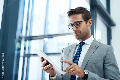 Smile, businessman and internet with tablet in office for networking, client communication and legal research. Male paralegal, technology and online for case management, document review and drafting.