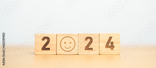 Smile face with 2024 block. Satisfaction, feedback, Review, mental health, eco sustainable and Happy New Year concept