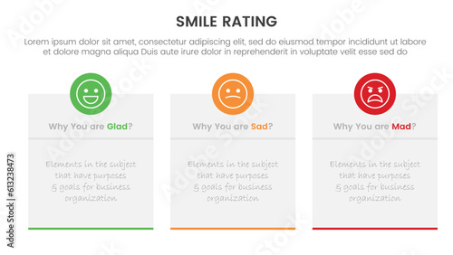 smile rating with 3 box template infographic concept with rectangle box symmetric for slide presentation with flat icon style vector