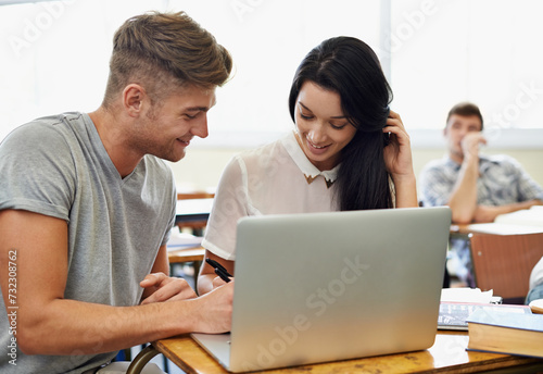 Smile, students and friends help on laptop, learning and knowledge in university for education. Team, man and woman in college on computer for information, test or study for exam together in class