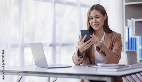 Smile Young business Asian woman freelancer is working her job on a laptop computer in a modern office. Doing accounting analysis report real estate investment data, Financial and tax systems concept.