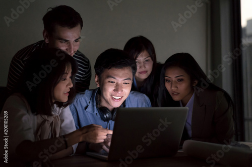 Smile young business people brainstorm working overtime late at nitgh. They are using laptop to search data. Setup studio shooting.