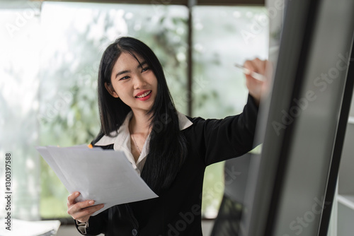 Smiling accountant presenting financial insights and tax strategies in a modern workspace.