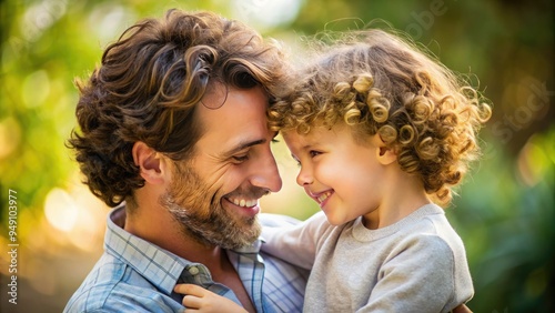 smiling adult male embracing and gazing down at curly-haired, giggling young child, both warmly lit against a soft, blurred background.