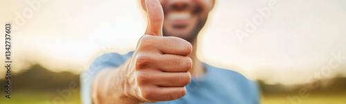 Smiling adult man giving thumbs up outdoors, expressing positivity and joy in natural setting. warm sunlight enhances cheerful atmosphere