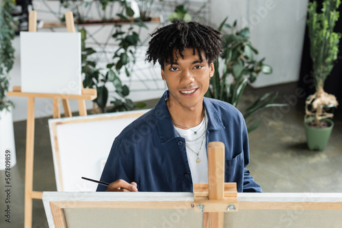 Smiling african american artist holding paintbrush and looking at camera near canvas in studio.