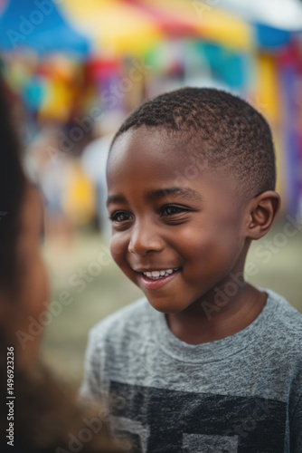 Smiling African American Boy Looking Upward, Representing Childhood Joy and Youthful Education, With Colorful Tent in Background : Generative AI