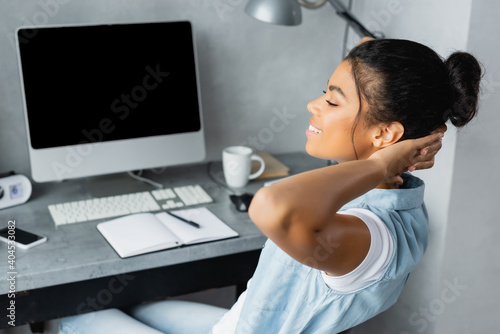 smiling african american freelancer near computer monitor with blank screen on blurred background