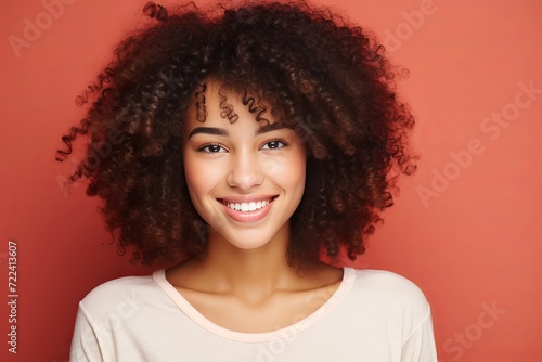 Smiling african american woman in white mock up t-shirt posed against vibrant solid background