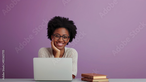 Smiling African American Woman with Laptop and Books on a Desk Against Purple Background.