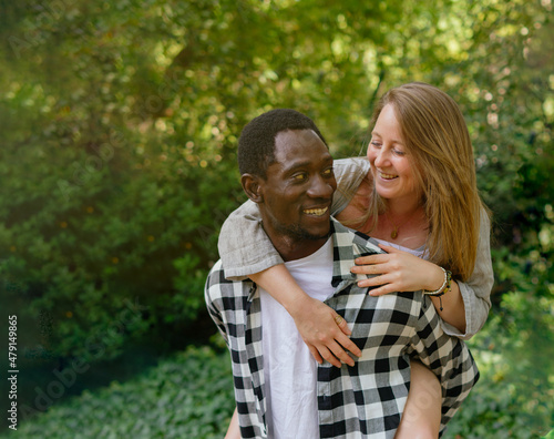 Smiling african man carrying his blonde blue-eyed girlfriend on his back in a green space