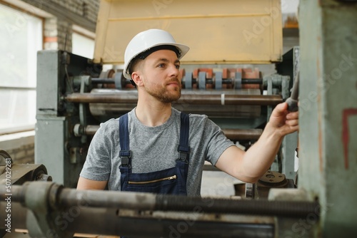 Smiling and happy employee. Industrial worker indoors in factory. Young technician with white hard hat.