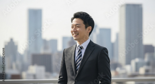 Smiling Asian Businessman Standing on Rooftop Overlooking City, selective focus