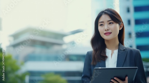 Smiling Asian businesswoman. Leader, entrepreneur, manager. Professional holding a tablet computer on the street of a big city on sky background.