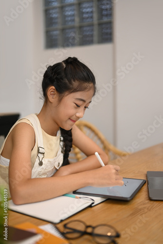 Smiling Asian girl doing homework on digital tablet, studying through online learning system