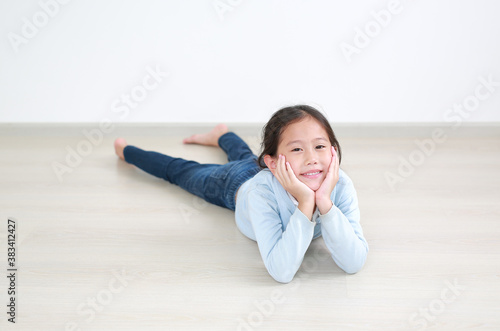 Smiling asian little kid girl lying on wood laminate flooring in the room with looking at camera.