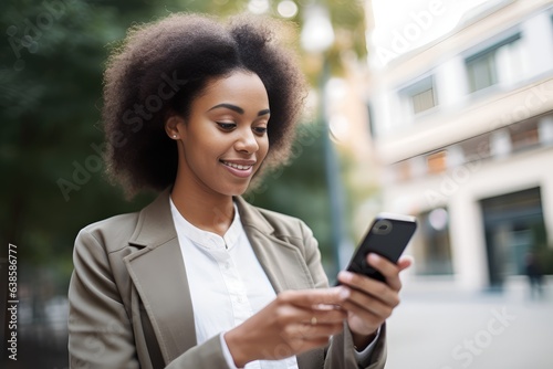 Smiling attractive young black businesswoman looking at her smart phone