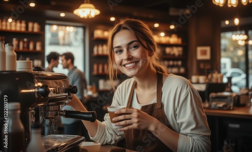 Smiling barista serving coffee indoors