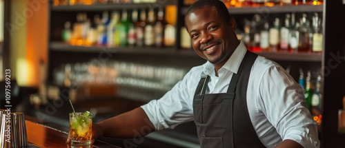 Smiling Bartender Serving Craft Cocktails at Trendy Bar | Professional Mixologist Behind Counter with Stocked Shelves of Spirits