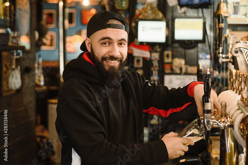 Smiling bearded barman pours beer into a glass. Friendly man working at the bar
