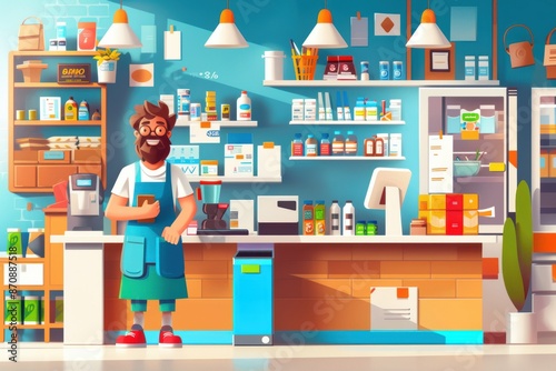 Smiling Bearded Man in an Apron Standing Behind the Counter in a Grocery Store