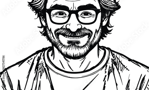 Smiling Bearded Man with Glasses | Friendly Line Art Portrait of Casual Male Character in Front View