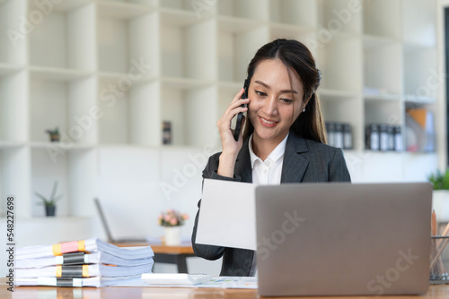 Smiling beautiful Asian businesswoman analyzing chart and graph showing changes on the market and holding smartphone at office.