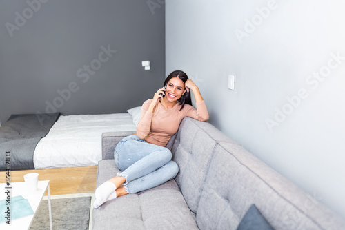 Smiling beautiful woman talking on the phone at home, happy young girl holds cellphone making answering call, attractive girl having pleasant conversation chatting by mobile with friend