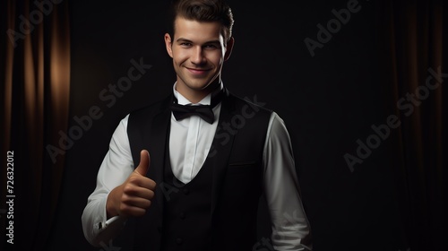 Smiling bellboy does thumbs up sign while he is wearing formal hotel attire in studio, expressing success and agreement. young man dressed as doorman shows like symbol, tourism industry.