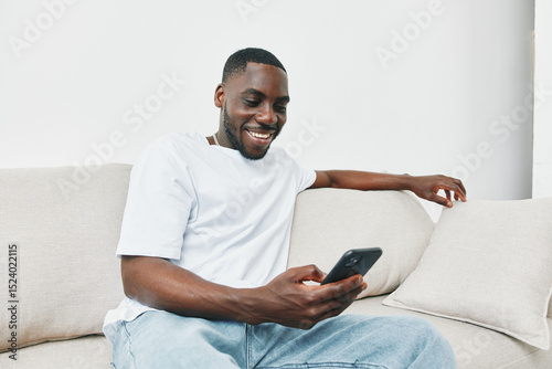 Smiling Black man casually browsing smartphone at home on a cozy couch in a relaxed atmosphere, enjoying leisure time and technology