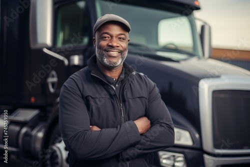 Smiling black truck driver standing proud in front of his truck with copy space right at sunset. Concept of transporters and truckers workers.
