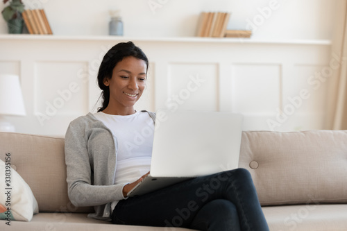 Smiling black young woman using modern laptop for study or work at home, rest and sit on sofa, watch funny video and surfing internet, spend weekend and free time, shopping in online store