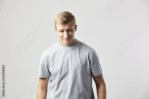 Smiling blond guy dressed in a white t-shirt stands on the white background in the studio