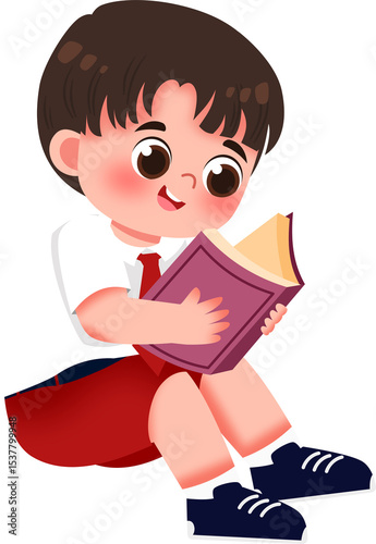 Smiling Boy in Uniform Seated Reading Book, Cartoon Illustration.
