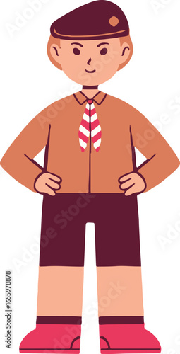 Smiling boy scout in uniform, standing proudly, hands on hips.