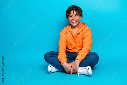 Smiling boy with an orange hoodie sitting cross-legged against a vibrant blue background showing youthful and joyful expression
