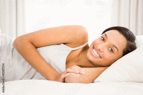 Smiling brunette lying on bed