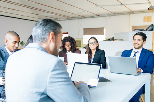 Smiling business people working with laptops in office. Group of cheerful managers sitting at table and typing on laptops. Business concept
