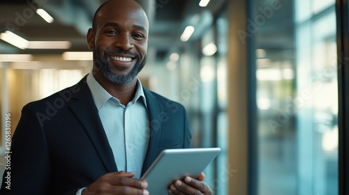 Smiling businessman holding tablet